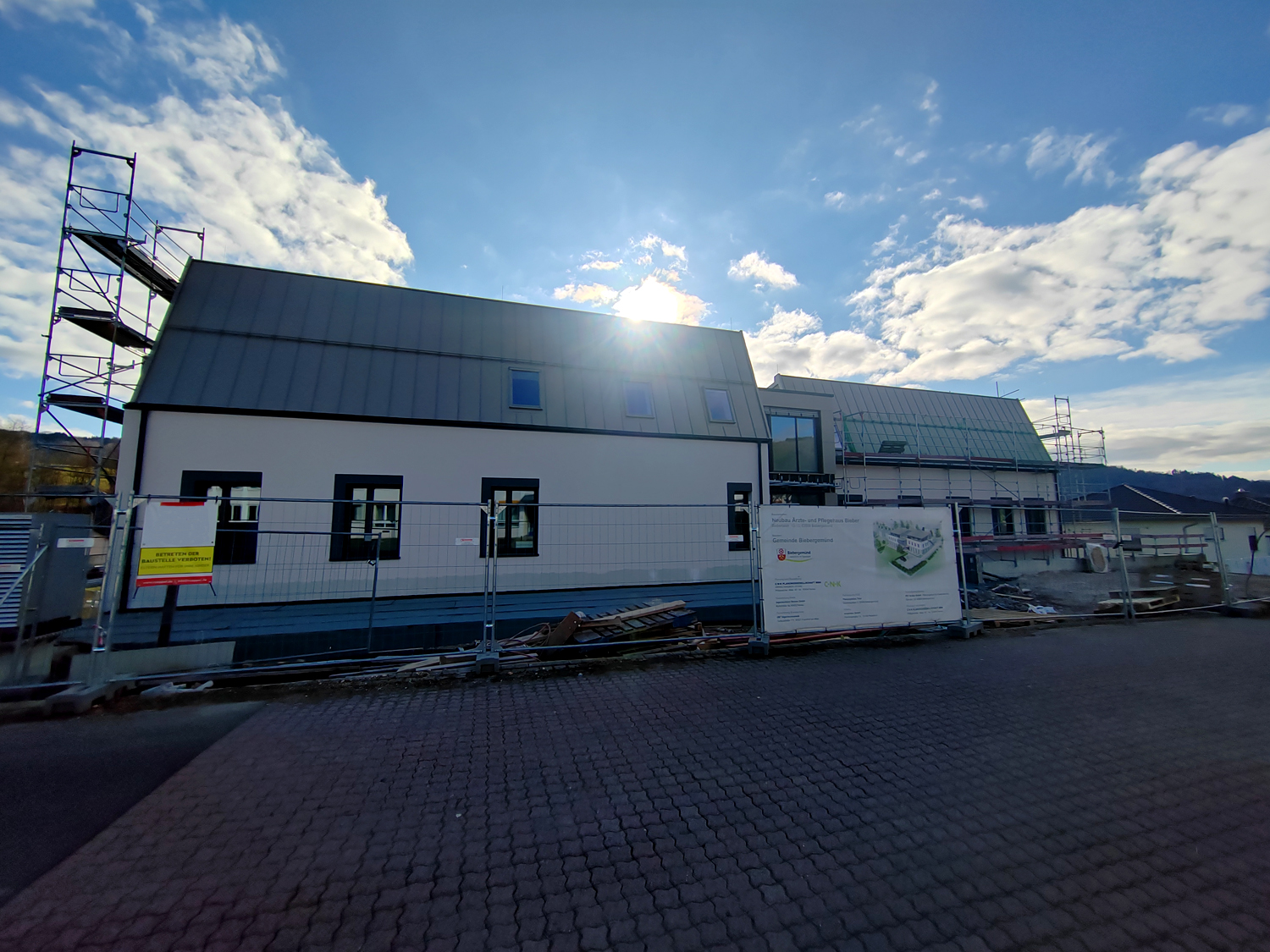 Der Gemeindevorstand der Gemeinde Biebergemünd hat die Errichtung eines Ärzte- und Pflegehauses zu Verbesserung der ärztlichen Versorgung und Seniorenbetreuung im Ortsteil Bieber beauftragt. Das Gebäude weist zwei Vollgeschosse sowie ein Staffelgeschoss auf. Dem Erdgeschoss ist der medizinische Bereich mit zwei Arztpraxen, einem Schulungsbereich und dem allgemeinen Eingangsbereich mit behindertengerechtem WC zugeordnet. Im Gartengeschoss befindet sich die Tagespflegeeinrichtung sowie Technik- und Nebenraumflächen. Das Dachgeschoss umfasst den Mietbereich Intensivpflege-Wohngemeinschaft für 6 Bewohner. Der Neubau wird als teilweise unterkellerter, dreigeschossiger Massivbau ausgeführt. Das oberste Geschoss wird dabei als Staffelgeschoss ausgeführt.